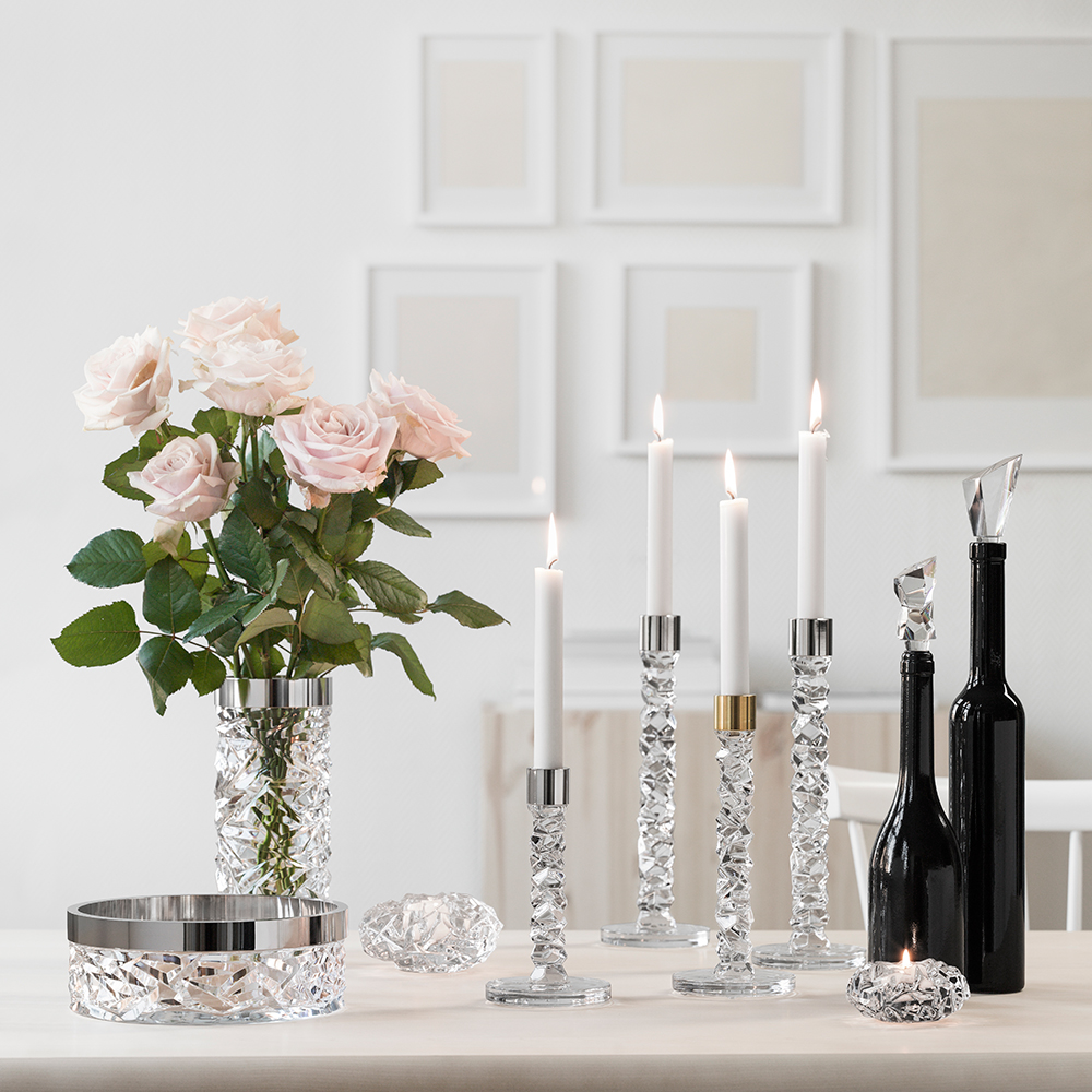Carat vas från Orrefors har en stilren och romantisk utformning och passar alla slags snittblommor. Den avlånga och ståtliga designen ger ett mycket elegant uttryck. Ställ den vackert på middagsbordet, i fönstret eller i hyllan i vardagsrummet. Vasen finns även i en vacker klotrund form.