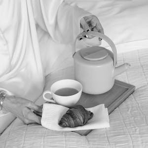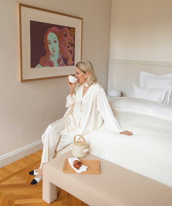 Välkommen in i Emilia de Porets sovrum, en plats där harmonin står i centrum. Rummet går i krämvita nyanser som fångar ljuset, och mjuka textilier bjuder in till avslappning.