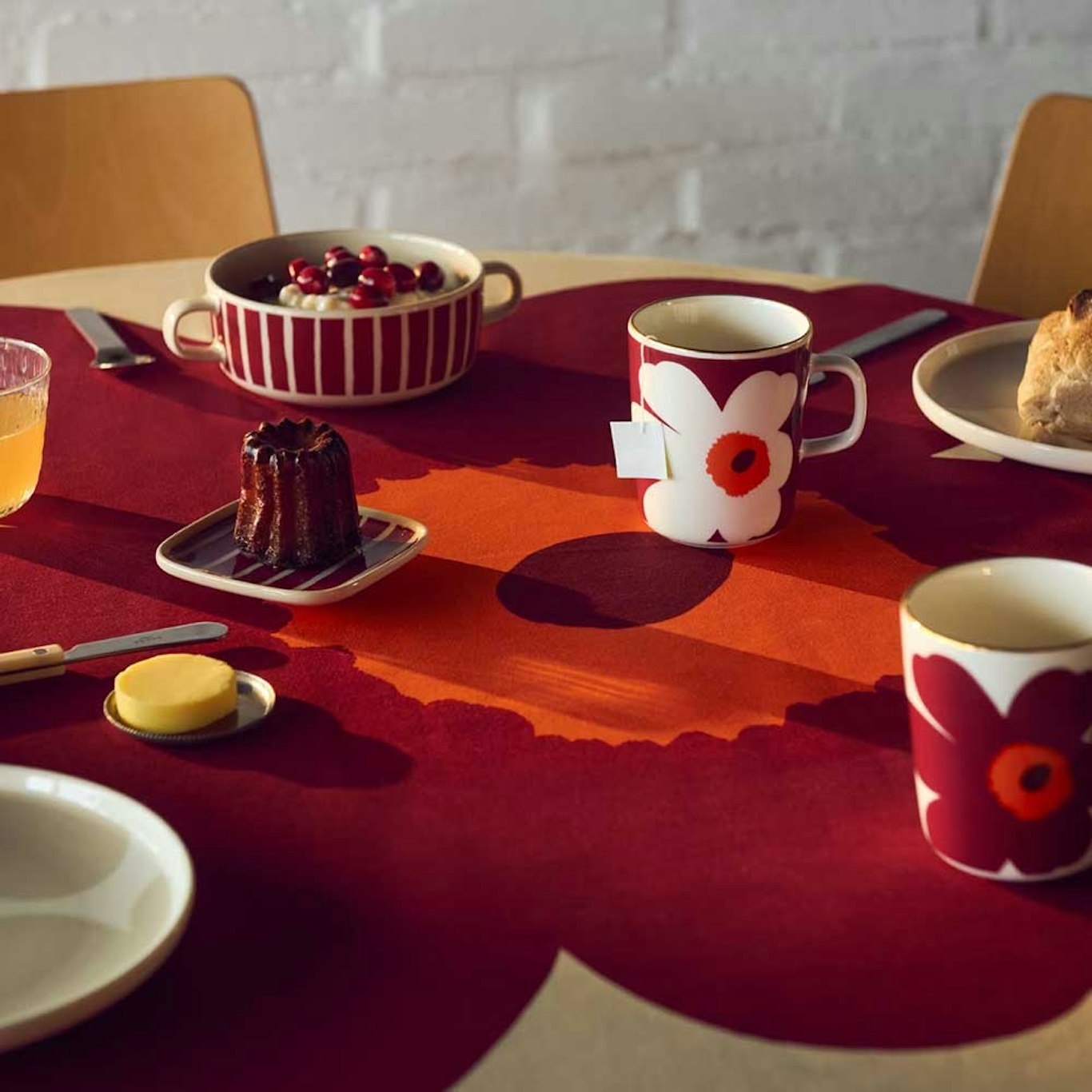 Unikko föddes under en tid då blommönster knappt förekom i Marimekkos kollektioner. Formgivaren Maija Isola lät sig ändå inspireras av blommornas formspråk och skapade en helt ny serie uttrycksfulla mönster. Nu kommer den ikoniska designen i en ny, djup röd nyans. En färg som kombinerar värme, djup och sofistikation – perfekt för säsongens dukningar och inredning.